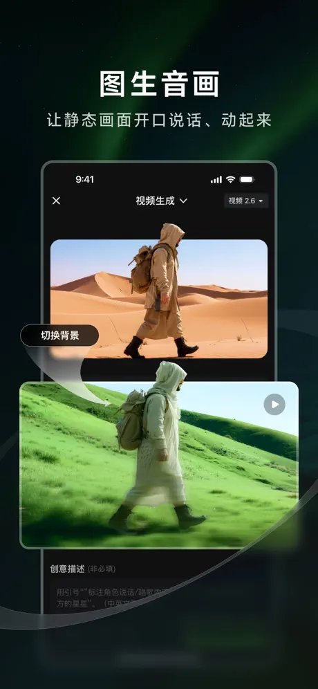 - AI视频创作:支持文生视频和图生视频双模式,只需输入文本描述或上传图片,即可让创意动起来,生成视频质量可达1080P电影级水准。更搭载视频续写功能,通过多次续写可生成长达3分钟的连贯创意内容,轻松满足剧情创作、分镜演示等多元需求。